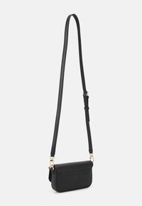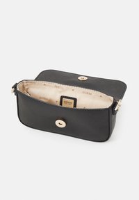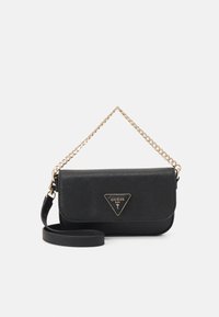 Sac bandoulière en similicuir noir avec une sangle à chaîne, un logo triangulaire doré et une surface texturée. Comprend un rabat de fermeture et une sangle ajustable.
