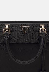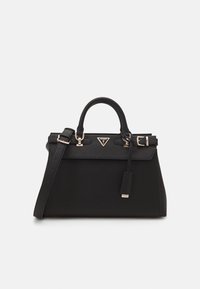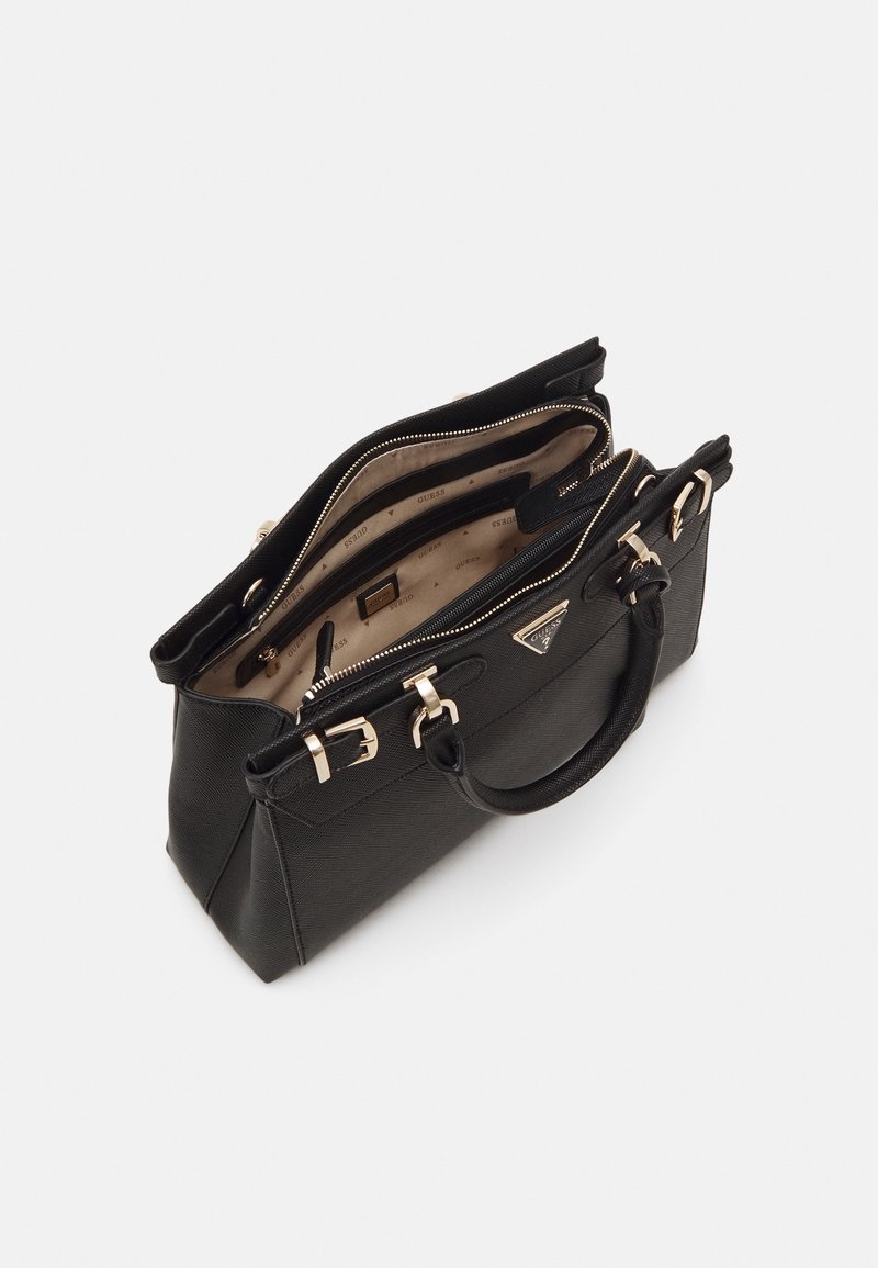 Sac à main structuré noir avec une surface texturée, une quincaillerie dorée, deux poignées et un intérieur spacieux avec une doublure à motifs.