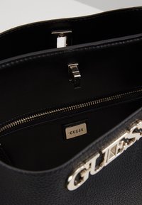 Sac à main en cuir noir texturé avec poignée supérieure et bandoulière ajustable, arborant le logo "GUESS" en argent sur le devant.
