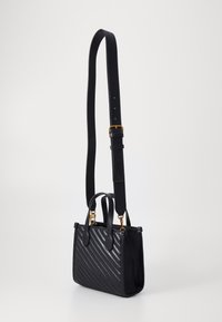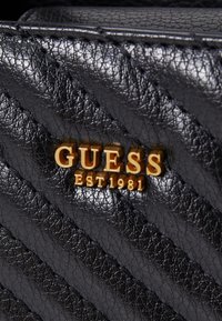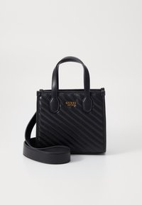Sac à main noir Guess avec texture en chevrons, deux poignées et bandoulière amovible sur fond blanc.