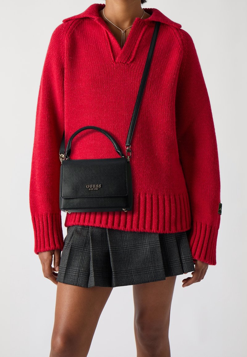 Personne portant un pull en maille rouge, une jupe plissée à carreaux gris et un sac bandoulière noir Guess avec logo doré.
