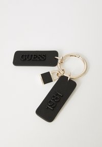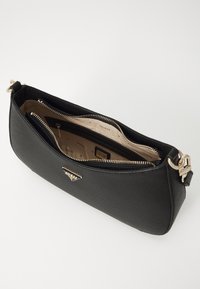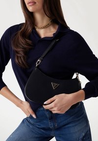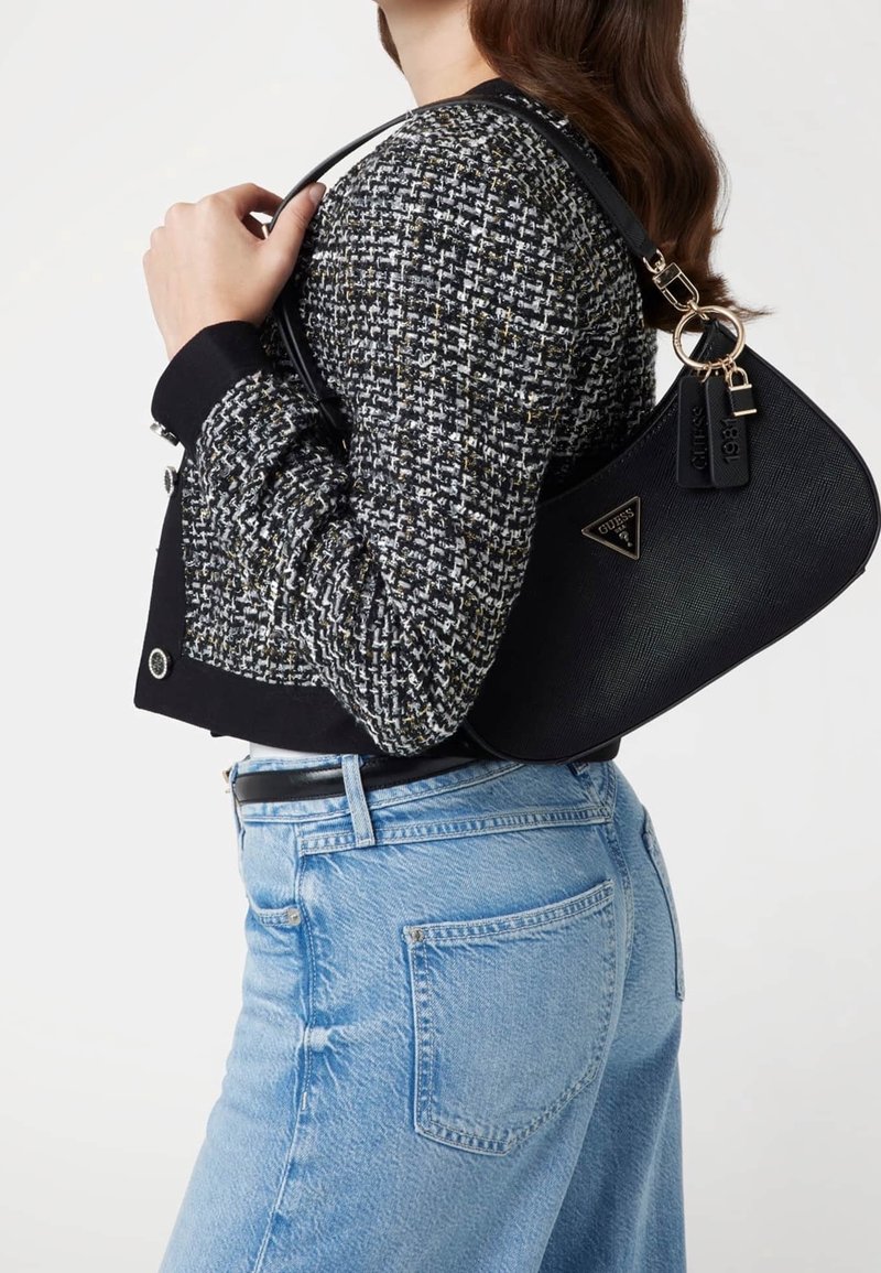 Femme portant une veste en tweed noir et blanc et un jean bleu clair, tenant un sac à bandoulière noir Guess avec des ferrures dorées sur l'épaule.