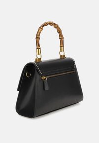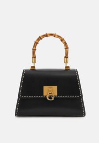 Sac à main en cuir noir avec poignée en bambou, fermoir doré avec logo "G", coutures blanches et bandoulière amovible.