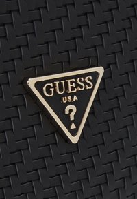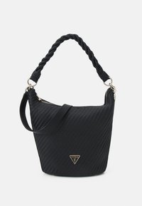 Sac à main noir tissé texturé avec une anse tressée, une bandoulière supplémentaire et un logo Guess doré au centre avant.
