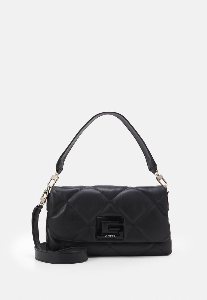 Sac à main noir matelassé avec poignée supérieure et bandoulière amovible, doté d'un rabat avant avec une boucle décorative en forme de "G".