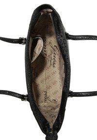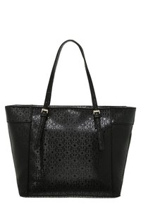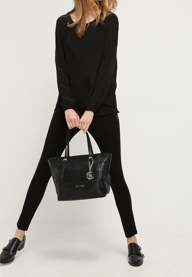Femme portant un haut, un pantalon et des chaussures noirs, tenant un sac fourre-tout noir Guess avec double poignées et un charme métallique devant elle.