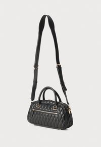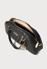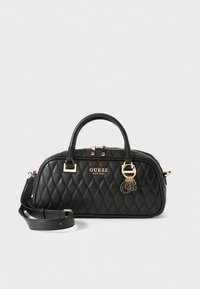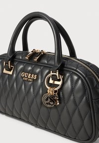 Sac à main matelassé noir de la marque Guess avec garnitures dorées, poignées supérieures, bandoulière amovible et breloque décorative avec les initiales de la marque.