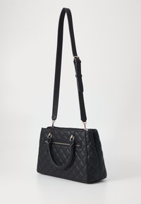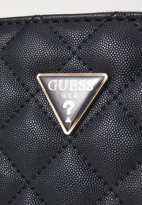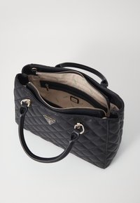 Sac à main noir matelassé avec deux anses, une bandoulière amovible et un logo triangulaire Guess au centre avant.