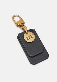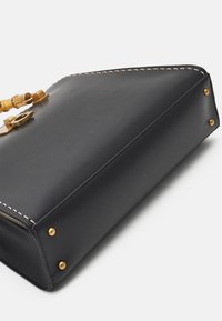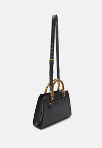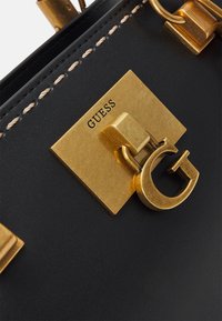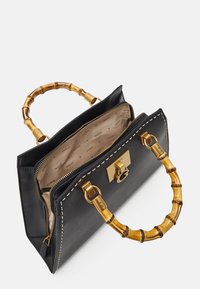 Sac à main structuré noir avec poignées en bambou, ferrures dorées, bandoulière détachable et pendentif logo Guess au centre avant.