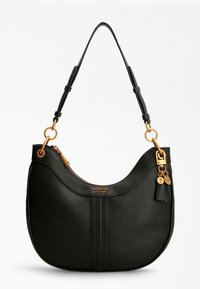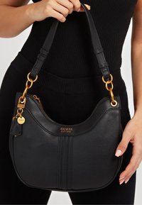Femme en haut noir sans manches tenant un sac à main Guess en cuir noir avec des ferrures dorées et un collier chaîne sur fond uni.