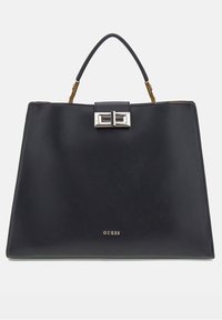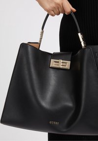 Femme portant une robe noire ajustée à côtes, tenant un grand sac à main en cuir noir Guess avec des accessoires dorés sur le bras.