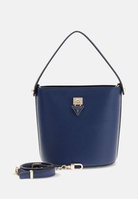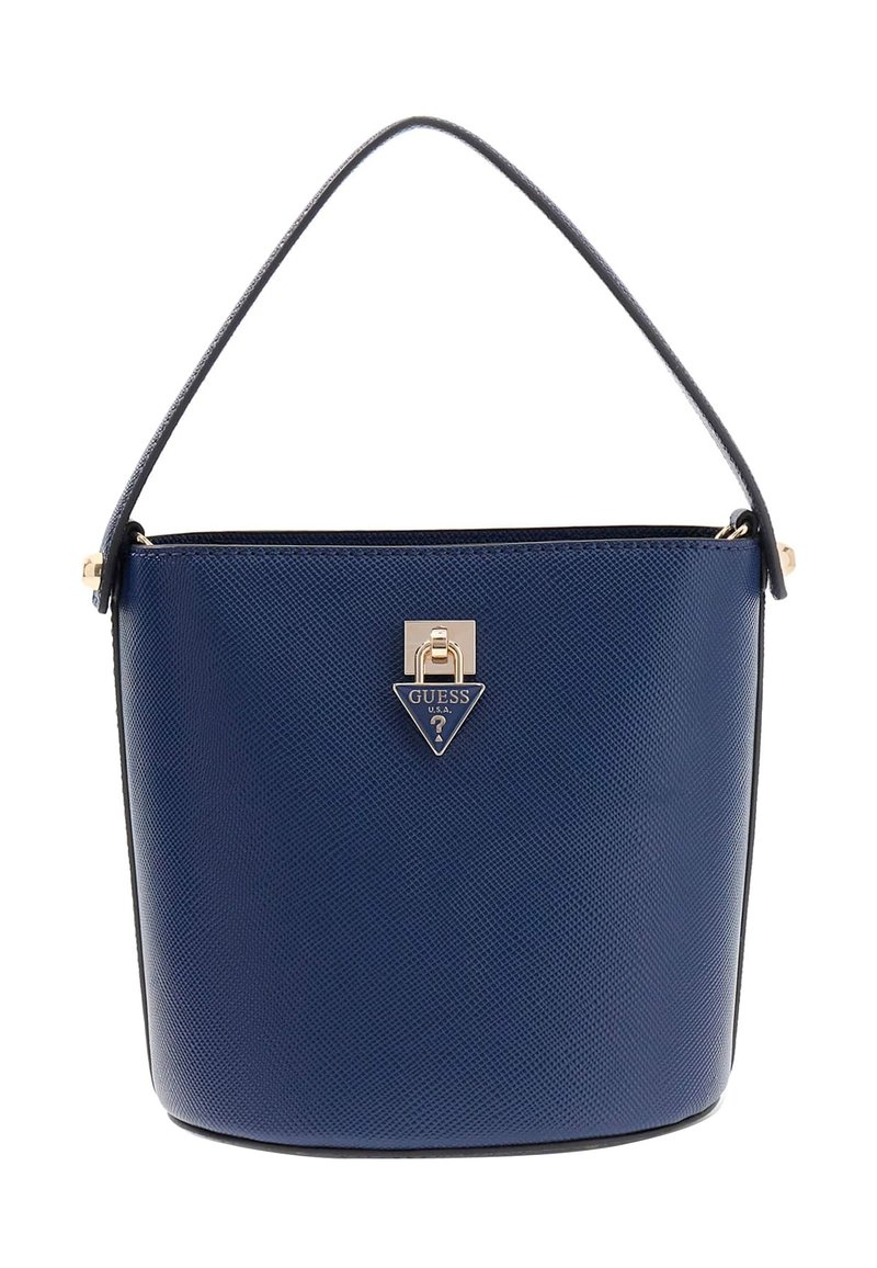 Sac à main seau bleu marine texturé avec une bandoulière unique et une fermeture à logo Guess en métal doré à l'avant.