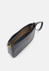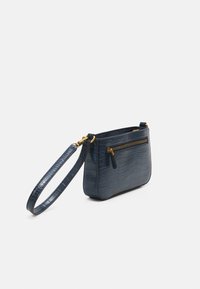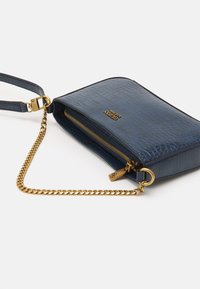 Petit sac poignet bleu marine à texture crocodile, logo doré "GUESS EST 1981" et bandoulière amovible avec fermoir doré sur fond blanc.