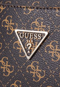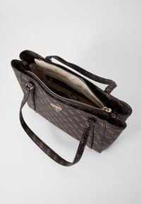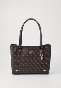 Sac fourre-tout Guess noir et marron avec un motif monogramme, double poignée, plaque triangulaire avec logo, et porte-clés suspendu sur un fond uni.