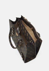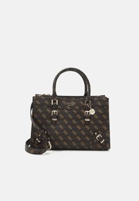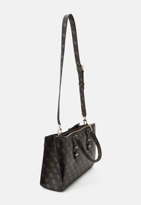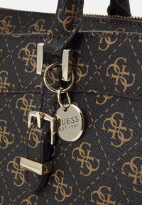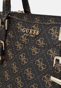 Sac à main Guess noir et marron avec logo à motifs, double poignée, détails à boucle sur le devant et bandoulière ajustable sur fond clair.