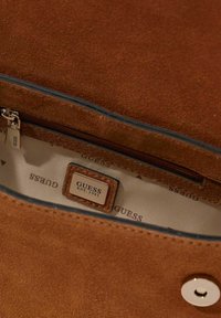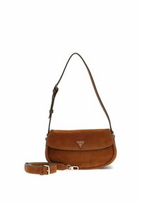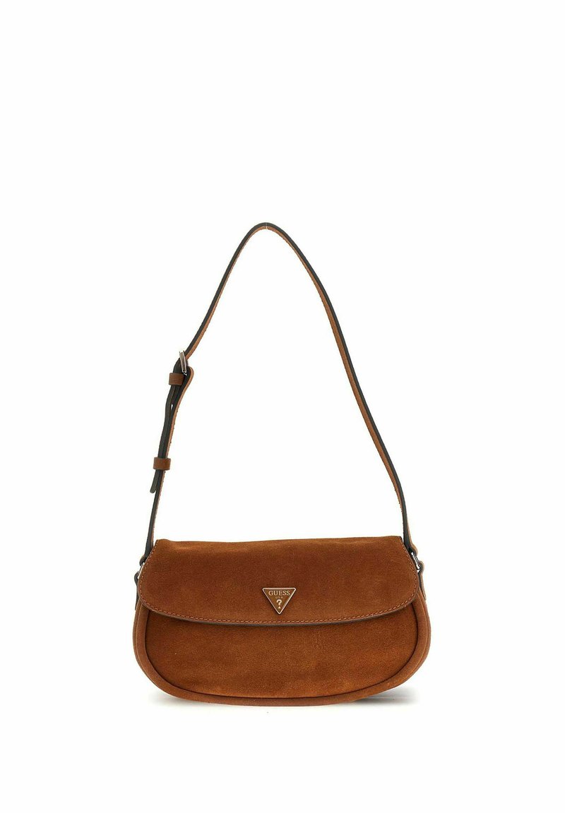 Sac à bandoulière en daim marron avec sangle réglable et logo triangulaire Guess sur le rabat avant.