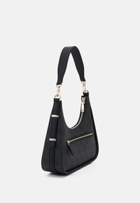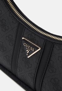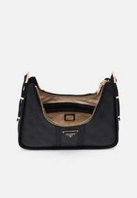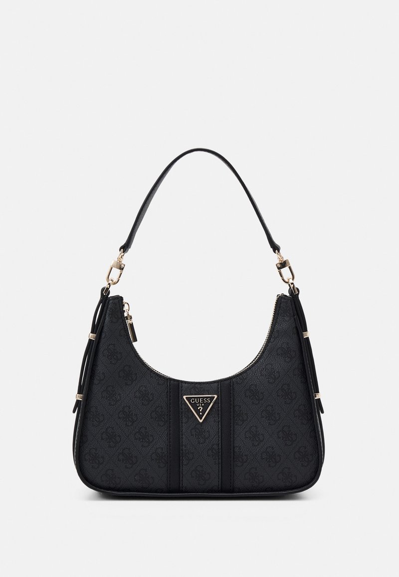 Sac hobo Guess noir avec une fine bandoulière, fermeture éclair, motif subtil du logo, et un emblème triangulaire en métal de la marque au centre avant.