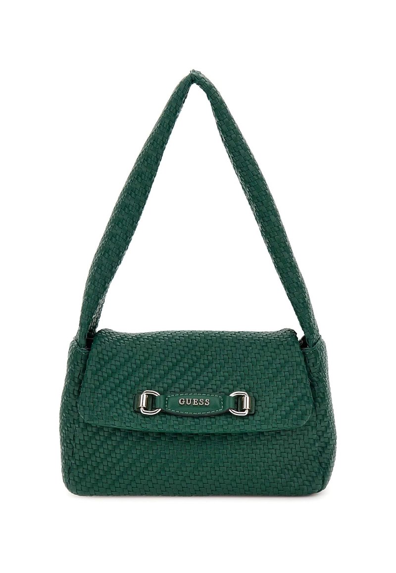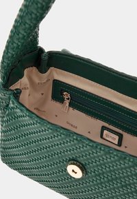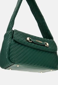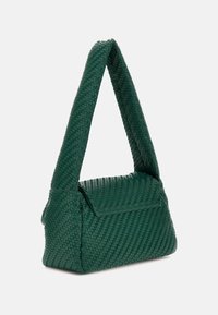 Sac à main vert tissé avec une forme structurée, doté d'un rabat supérieur, de ferrures argentées et d'une bandoulière courte et rembourrée. Nom de la marque visible à l'avant.