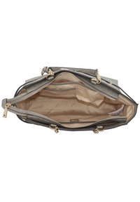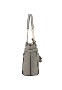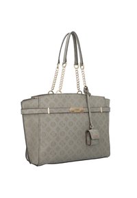 Sac cabas gris de Guess avec imprimé logo en motif, poignées chaîne dorées et une petite pochette assortie suspendue à une des anses.