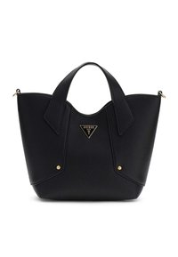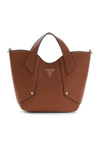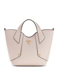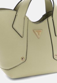Sac à main en cuir texturé vert clair avec deux poignées supérieures et une plaque triangulaire du logo Guess au centre avant.