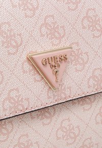 Sac à épaule structuré rose clair avec bandoulière ajustable et motif monogramme subtil, vu légèrement en angle sur un fond blanc.