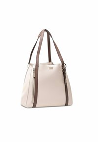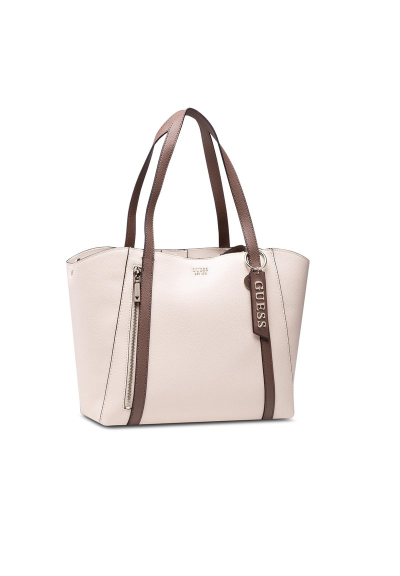 Sac fourre-tout beige avec poignées et bordures brun foncé, poche zippée à l'avant, et une étiquette suspendue marquée "GUESS".