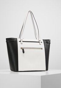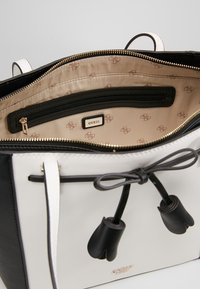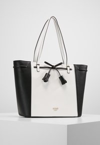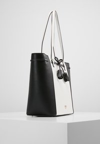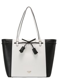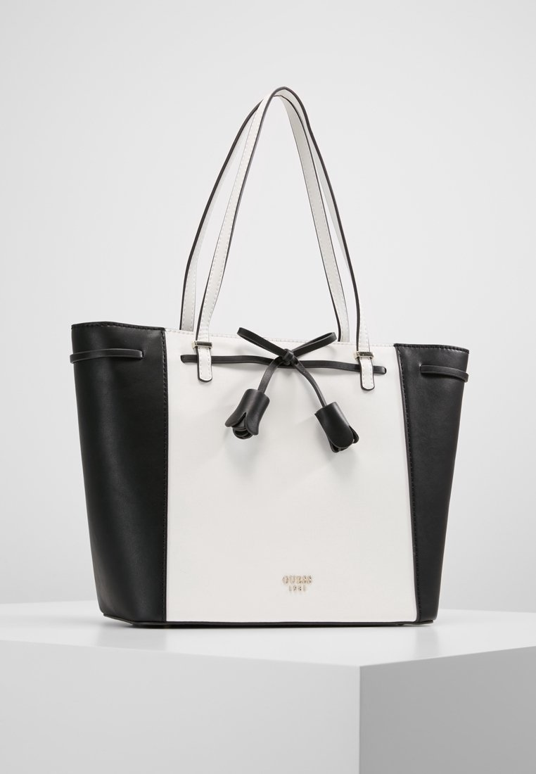 Sac fourre-tout noir et blanc avec deux poignées, nœud décoratif noir en forme de fleurs et petit logo doré au centre avant.
