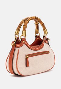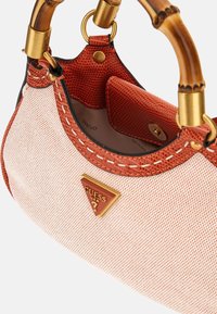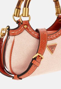 Petit sac à main Guess beige et orange avec des anses de style bambou et des détails logo et breloque dorés.