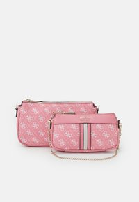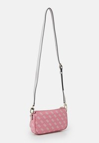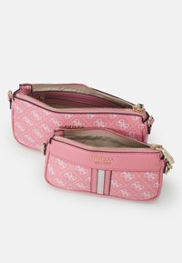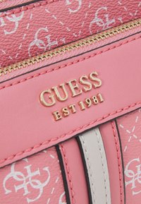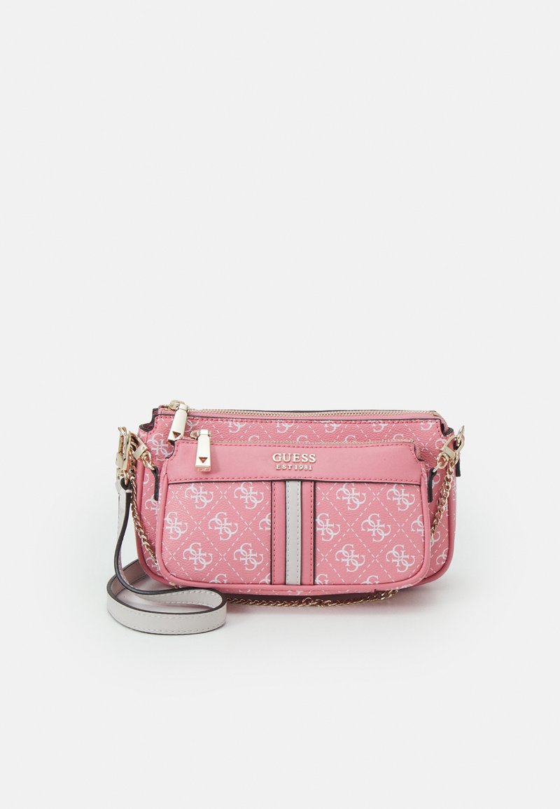 Petit sac bandoulière rose de la marque Guess avec motif de logo blanc, deux bandes verticales à l'avant, fermetures éclair dorées, et une sangle grise ajustable avec détail en chaîne.