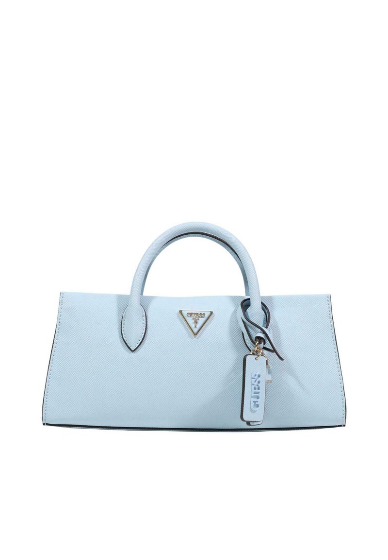 Sac à main rectangulaire bleu clair avec poignées arrondies, surface texturée, logo triangulaire doré et étiquette de marque attachée.