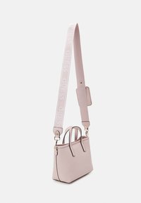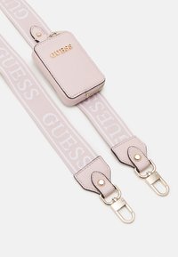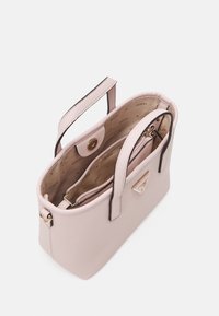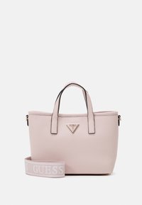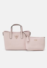 Sac cabas rose clair texturé avec deux poignées, bandoulière large amovible affichant "GUESS", et logo métallique triangulaire à l'avant.