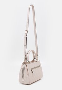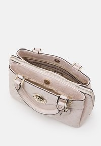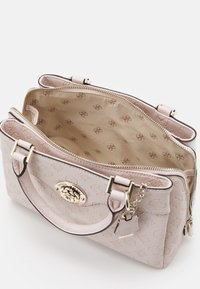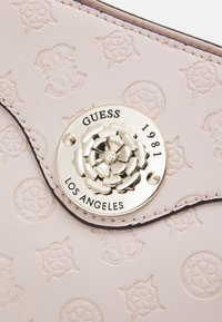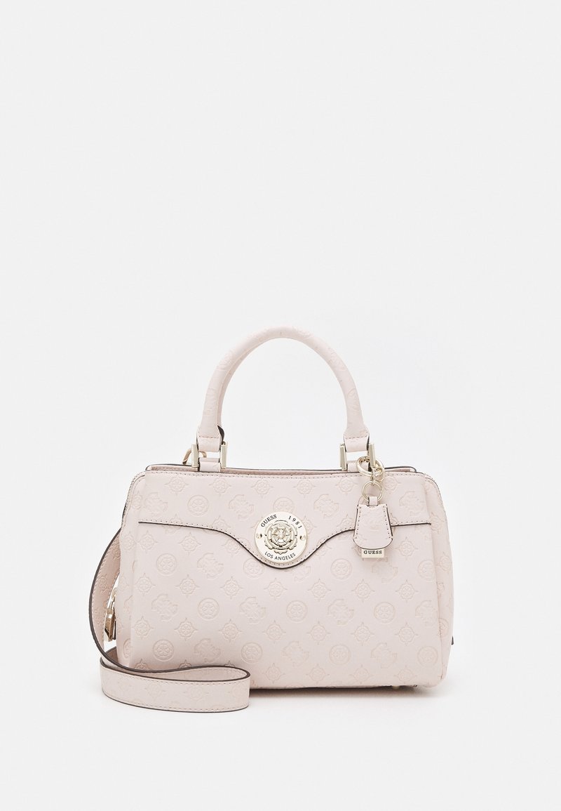 Sac à main Guess rose clair avec motif de logo embossé, poignées supérieures, bandoulière amovible et emblème rond en métal doré avec logo à l'avant.