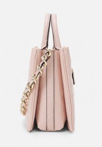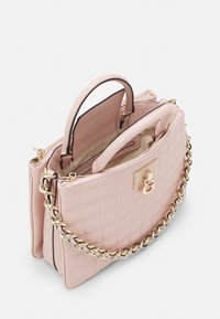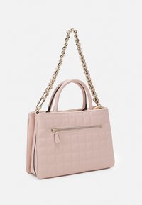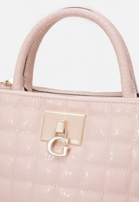 Sac à main matelassé rose clair avec poignée supérieure et bandoulière chaîne dorée, doté d'un fermoir logo "G" en or sur un fond uni.