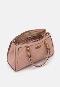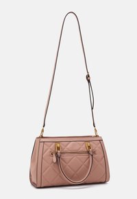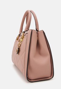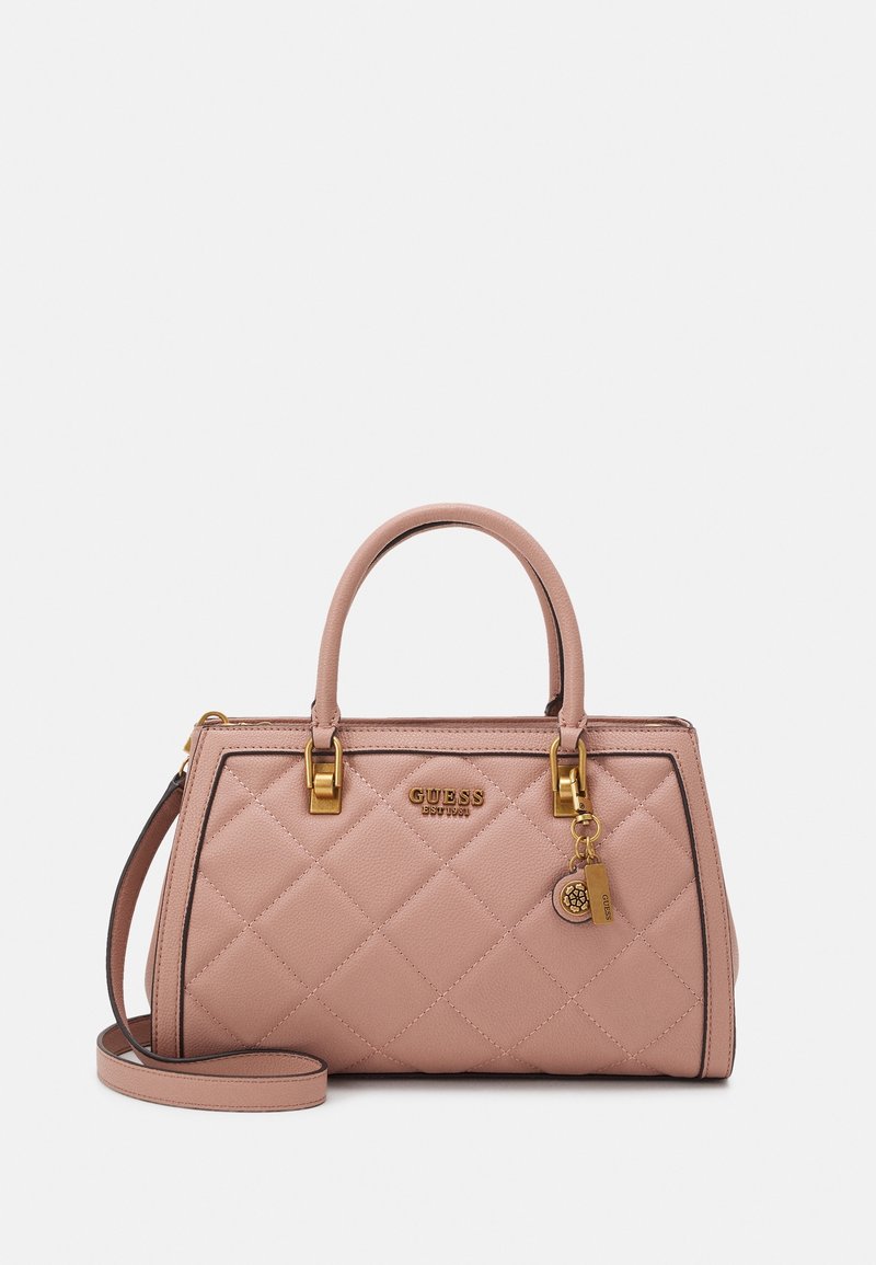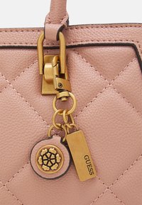 Sac à main en cuir matelassé rose avec quincaillerie dorée, double poignées, bandoulière amovible et petit charm décoratif.