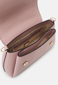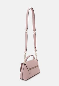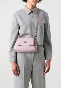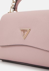 Sac à bandoulière en cuir texturé rose clair avec rabat à fermeture, ferrures dorées, sangle réglable et inscription "GUESS EST 1981" embossée à l'avant.