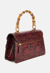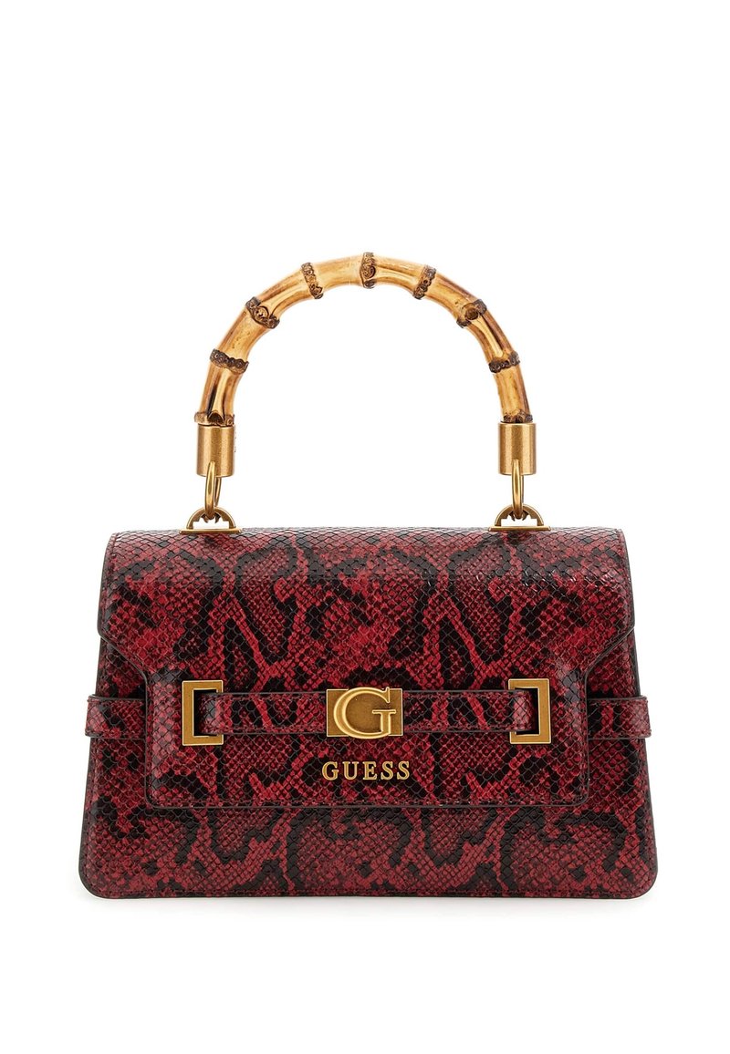 Sac à main à motif peau de serpent rouge et noir avec poignée style bambou et logo "Guess" doré sur le rabat avant.