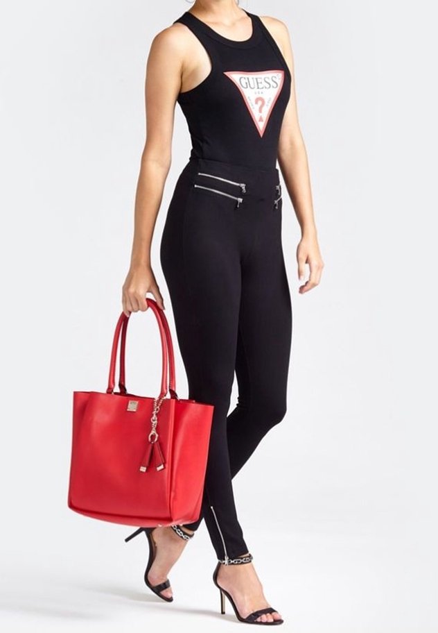 Femme portant un haut sans manches noir de la marque Guess et un pantalon ajusté avec des détails zippés, tenant un grand sac à main rouge et portant des sandales à talons noirs.