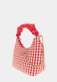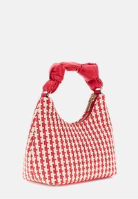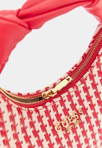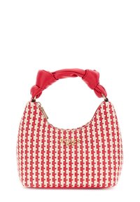 Sac à main tissé rouge et blanc avec une poignée en cuir rouge torsadée et un logo doré "GUESS" sur le devant.