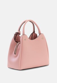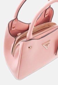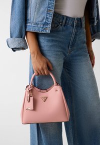 Femme portant une veste en denim bleu et un jean sur un débardeur blanc, tenant un sac à main rose des deux mains devant elle.