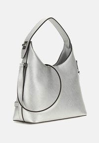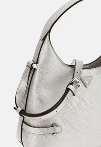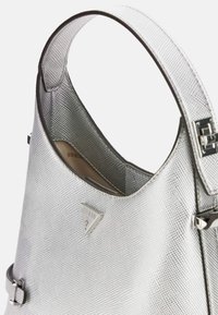 Sac à main texturé argenté avec double poignées, logo triangulaire Guess à l'avant, et bandoulière réglable contre un fond blanc.