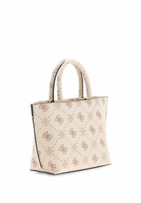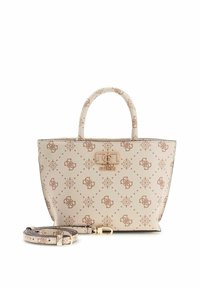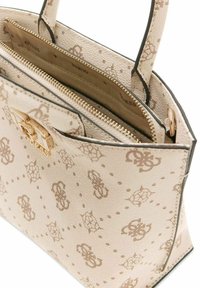 Sac fourre-tout beige avec motif du logo Guess marron, doubles poignées et plaque du logo Guess en métal doré au centre devant.