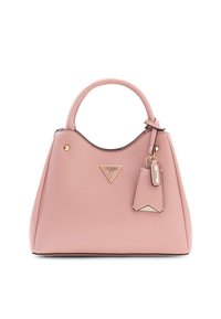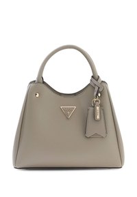 Sac à main en cuir gris clair avec poignée arrondie, ferrures dorées et logo triangulaire Guess sur le devant avec une étiquette suspendue.