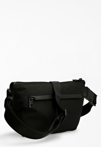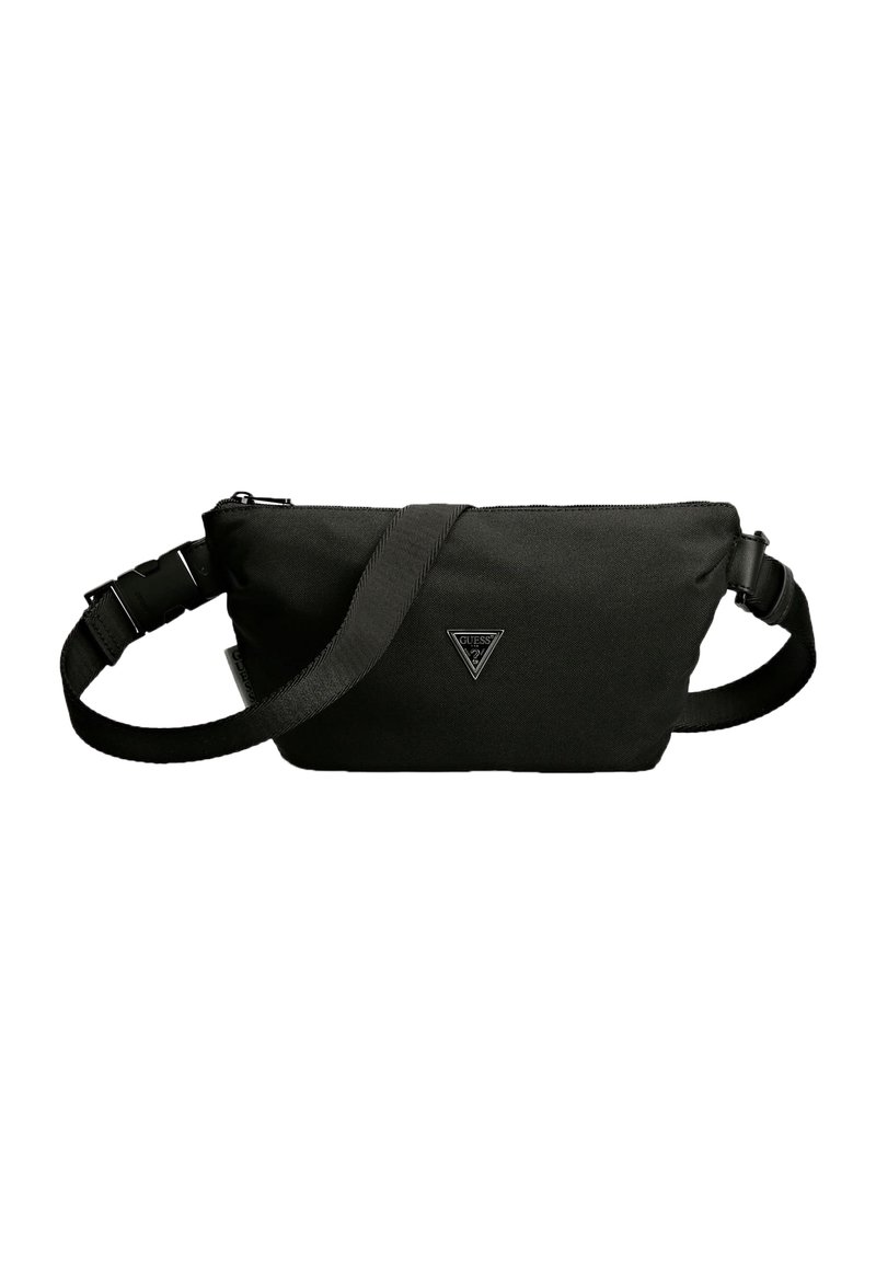 Sac banane en tissu noir avec sangle réglable et boucle, arborant un logo triangulaire Guess sur le devant et une fermeture éclair en haut.
