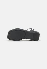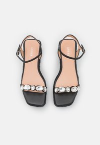 Sandales noires à talons avec un talon bloc texturé, une bride lisse et scintillante traversant les orteils, et une sangle à la cheville avec une boucle métallique.