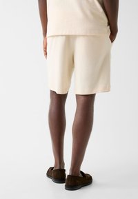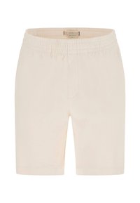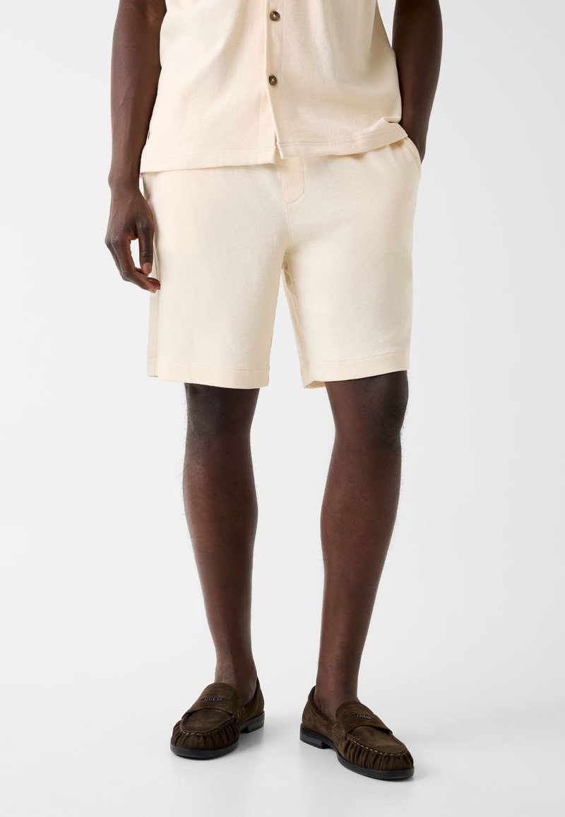 Shorts couleur crème avec une taille élastique, détail de logo subtil, jambes droites et texture douce, assortis à des baskets de teintes neutres.
