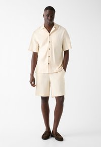 Homme portant un short de couleur crème, une chemise boutonnée assortie et des mocassins marron foncé sans lacets, sur un fond uni.