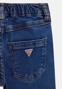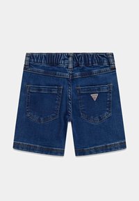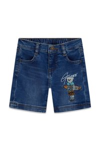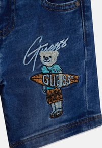 Short en denim bleu foncé avec poches frontales et broderie d'un ours tenant une planche de surf avec le texte "Guess" sur la jambe droite.