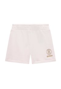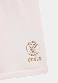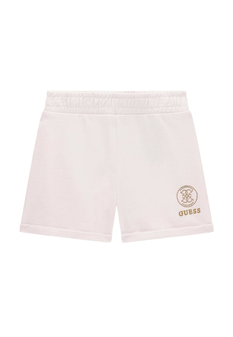 Shorts blancs à taille élastique avec un petit logo et emblème Guess dorés sur la partie inférieure gauche de la jambe.