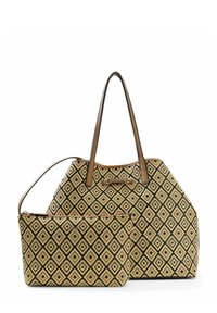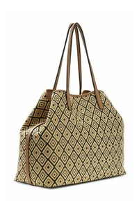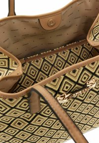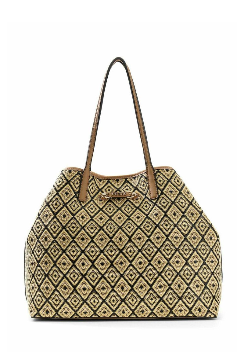 Sac fourre-tout avec un motif en losanges noirs et beiges, des poignées en cuir marron, et une petite étiquette métallique portant l'inscription "GUESS" au centre avant.