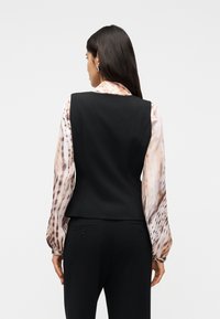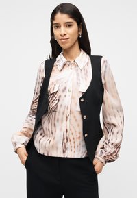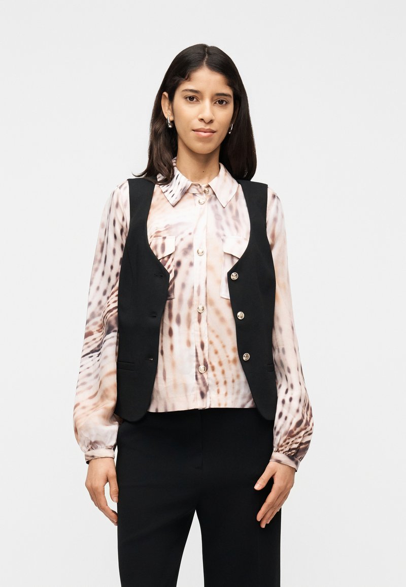 Femme portant un chemisier à manches longues et à motifs, avec un gilet noir boutonné et un pantalon noir, debout devant un fond clair uni.